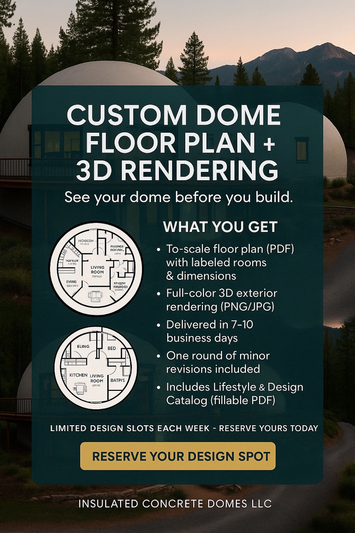 Turn your dream into a design you can actually see. With this package, our design team creates a custom, to-scale floor plan and a full-color 3D rendering of your dome — tailored to your vision and delivered in just 7–10 business days.